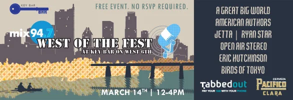WEST OF THE FEST 2014 Friday, March 14, 2014 12:00 PM 4:00 PM 12:00 16:00 Google Calendar ICS MIX 94.7 presents the 4th Annual West Of The FestKey Bar - 617 W. 6th St, Austin, TX 78701